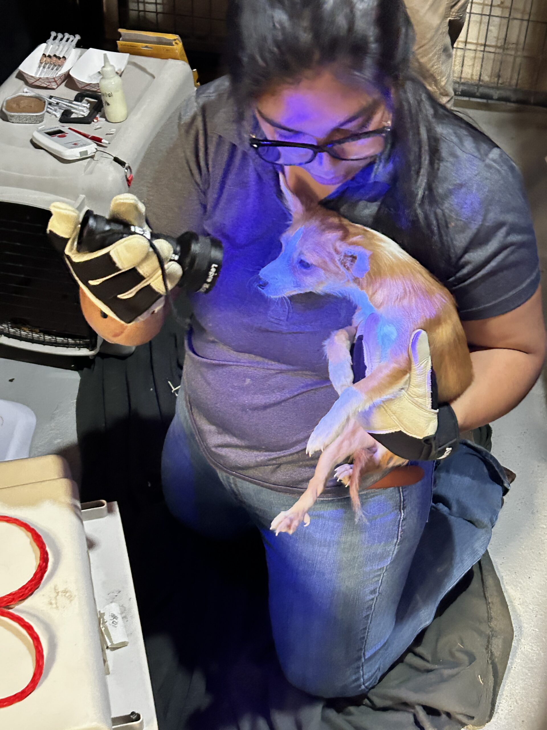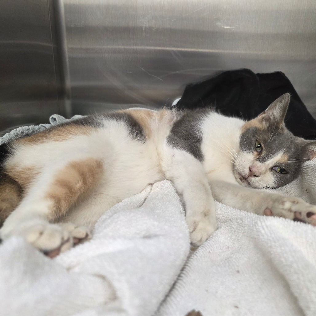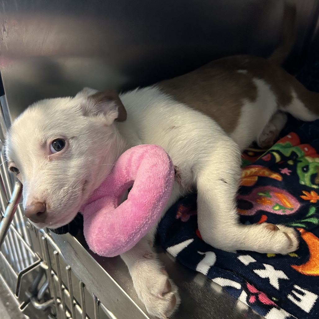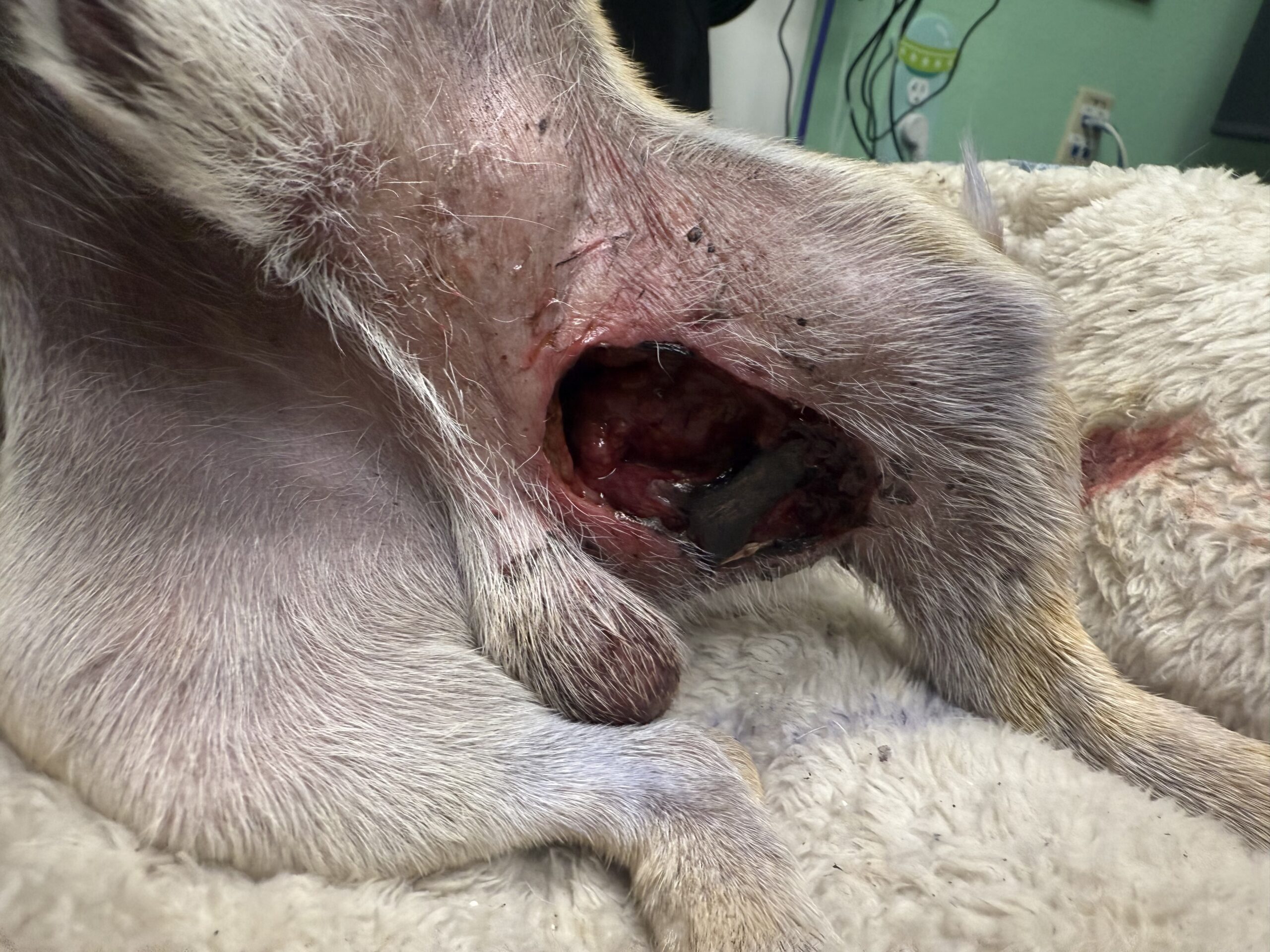 Vicryl came to us from a partner shelter that didn’t have the resources to save her. She arrived in critical condition, unable to eat on her own, with a broken scapula, a puncture wound to her shoulder, and injuries consistent with an animal attack.