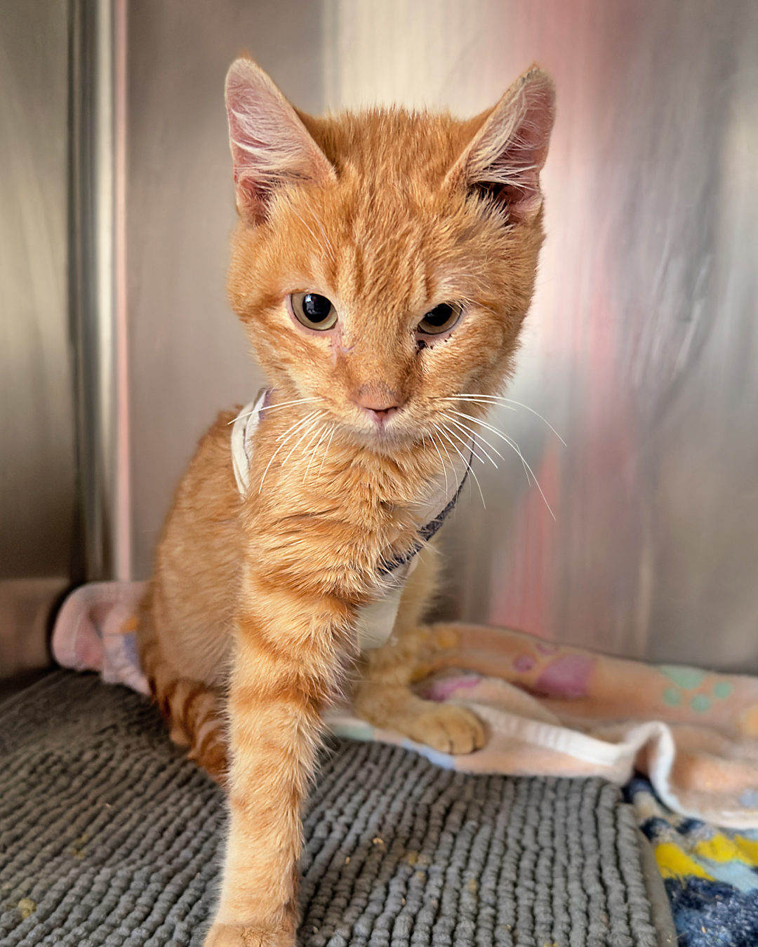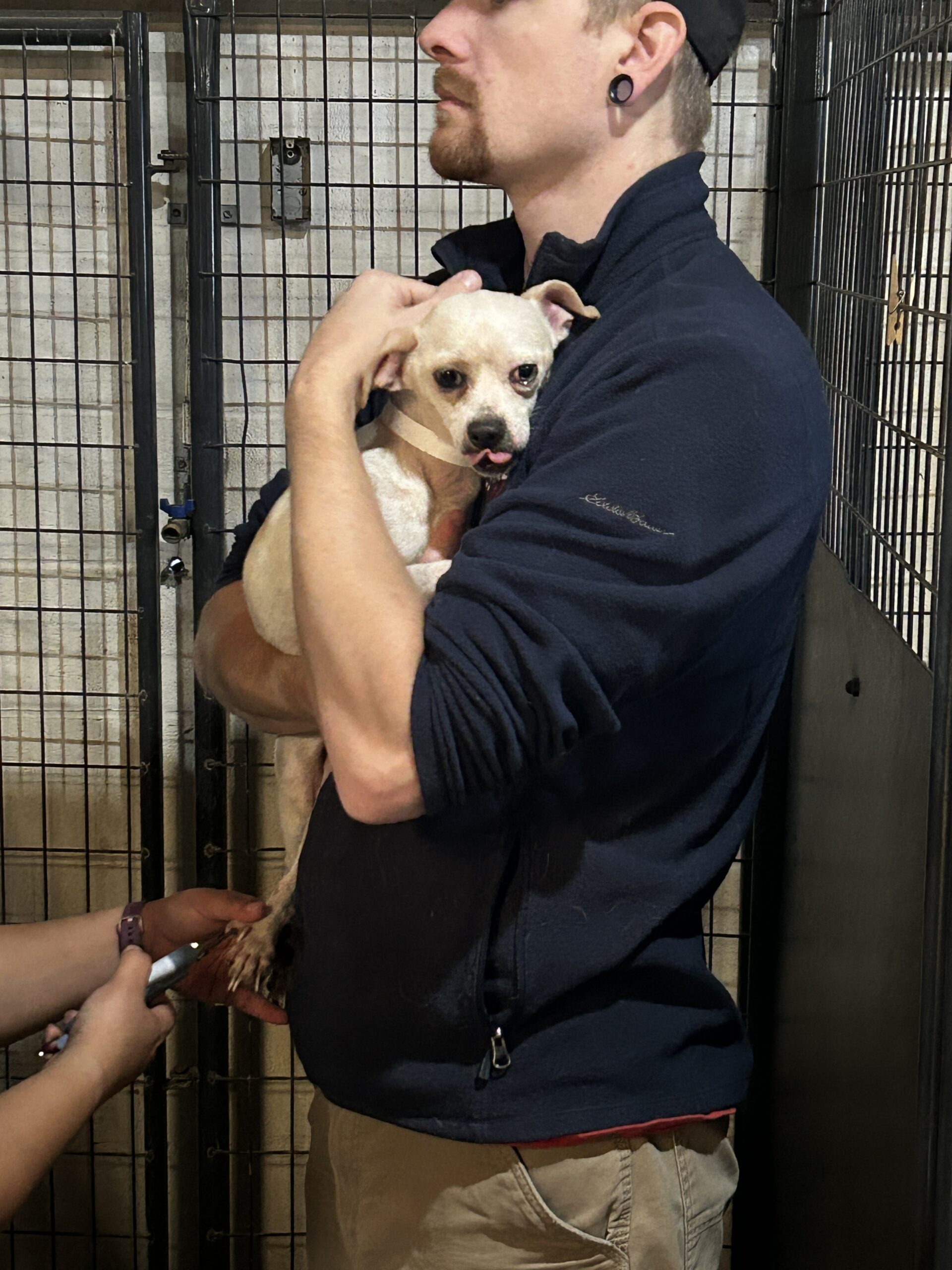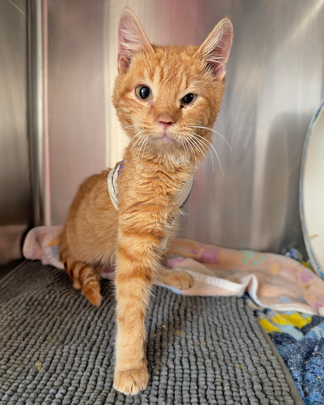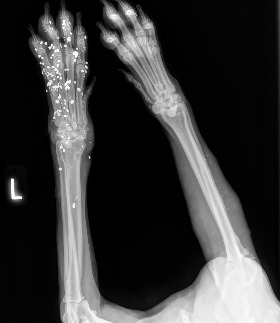 Squid came to us from a partner shelter that couldn’t provide the care he desperately needed. He had been shot in the leg with birdshot, leaving multiple pellets embedded in his leg and causing severe pain. Without treatment, he faced serious complications, including lead toxicity.