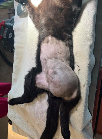 Eve came to us after likely being hit by a car, suffering multiple injuries including a broken tail/back, a damaged right femur, and pelvic trauma.