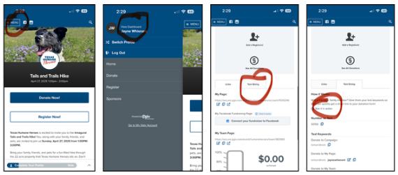 Did you know that texting is the easiest way to fundraise? You can share your fundraising page directly on social media or with friends. You can log into your fundraising account on a mobile device, scroll down to the “text giving” option, and then copy links to your page. You can also click the “see it in action” option to see a tutorial.